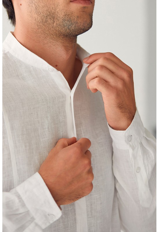 Upgrade your wardrobe with our classic linen shirt for men. Featuring a band collar and button closure, this shirt is both stylish and versatile. The loose fit design offers a comfortable and relaxed feel, making it perfect for any occasion. Made from high-quality linen, this shirt is perfect for any season, providing a cool and breathable feel that's gentle on your skin. The long sleeves with barrel cuffs add a touch of sophistication, while the slightly rounded edges give it a modern and stylish look.