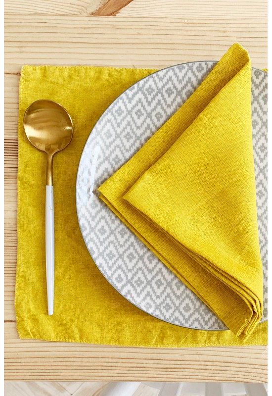 Add a pop of color to your table setting with our bright and beautiful yellow linen table placemats. Perfect for any occasion, these premium linen placemats are made of high-quality fabric, ensuring durability and longevity. Whether you're having a dinner party or just setting the table for an everyday meal, our yellow placemats are the perfect addition to your decor. Our bright cloth table placemats are available in 1 piece or sets and come in various sizes, ensuring a perfect fit for any table. The cheerful and sunny yellow color of these placemats will make your table setting come alive, whether you're going for a sunflower or lemon theme.